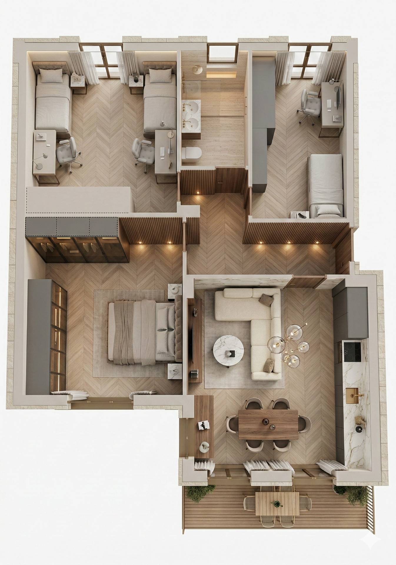 L’appartamento, che sviluppa una superficie complessiva di circa 100 metri quadrati, è posto al terzo piano di un edificio attualmente oggetto di un integrale intervento di ricostruzione edilizia, con consegna prevista per l’inizio 2028. La distribuzione degli spazi interni è stata progettata secondo criteri di razionalità e comfort abitativo, prevedendo un ingresso che conduce una comoda zona giorno destinata a soggiorno-pranzo con accesso diretto a un primo balcone. La zona notte, separata da un funzionale disimpegno, comprende due camere da letto matrimoniali, un servizio igienico principale e una terza camera da letto singola dotata di un ulteriore sfogo esterno su balcone privato.
